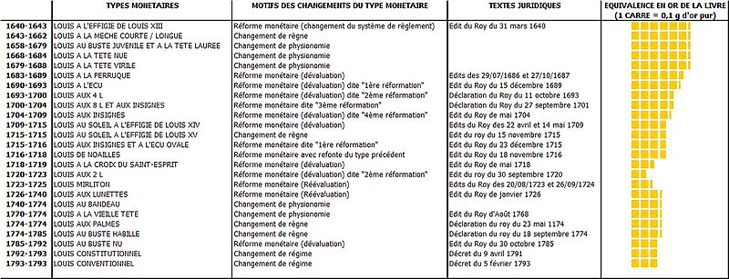 Système monétaire du royaume de France indique deux tableaux, sans référence bibliographique malheureusement, concernant l'histoire de la numismatique française et permettant également la conversion de données. Le second tableau s'intéresse à l'équivalence en or du louis, entre 1640 et 1793.