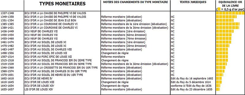 Système monétaire du royaume de France indique deux tableaux, sans référence bibliographique malheureusement, concernant l'histoire de la numismatique française et permettant également la conversion de données. Le premier tableau s'intéresse à l'équivalence en or de la livre pour l'écu, entre 1337 et 1657